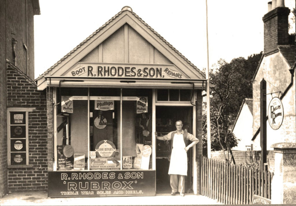 At the outbreak of the Second World War, Raymond Henry Rhodes volunteered to be a member of the village’s Air Raid Precautions (ARP) team, patrolling the streets and farms to identify lights or fires which may alert enemy planes and identify where bombs had fallen. His son, Raymond Cecil, tried to enlist in the army, but was barred admission as cobblers were essential to the war effort. As a result, father and son worked tirelessly to repair and make hundreds of army boots. Henry Cecil also became the leading officer of the Billingshurst Fire Brigade and a collection of helmets still adorn the back room of the cobblers’ shop.