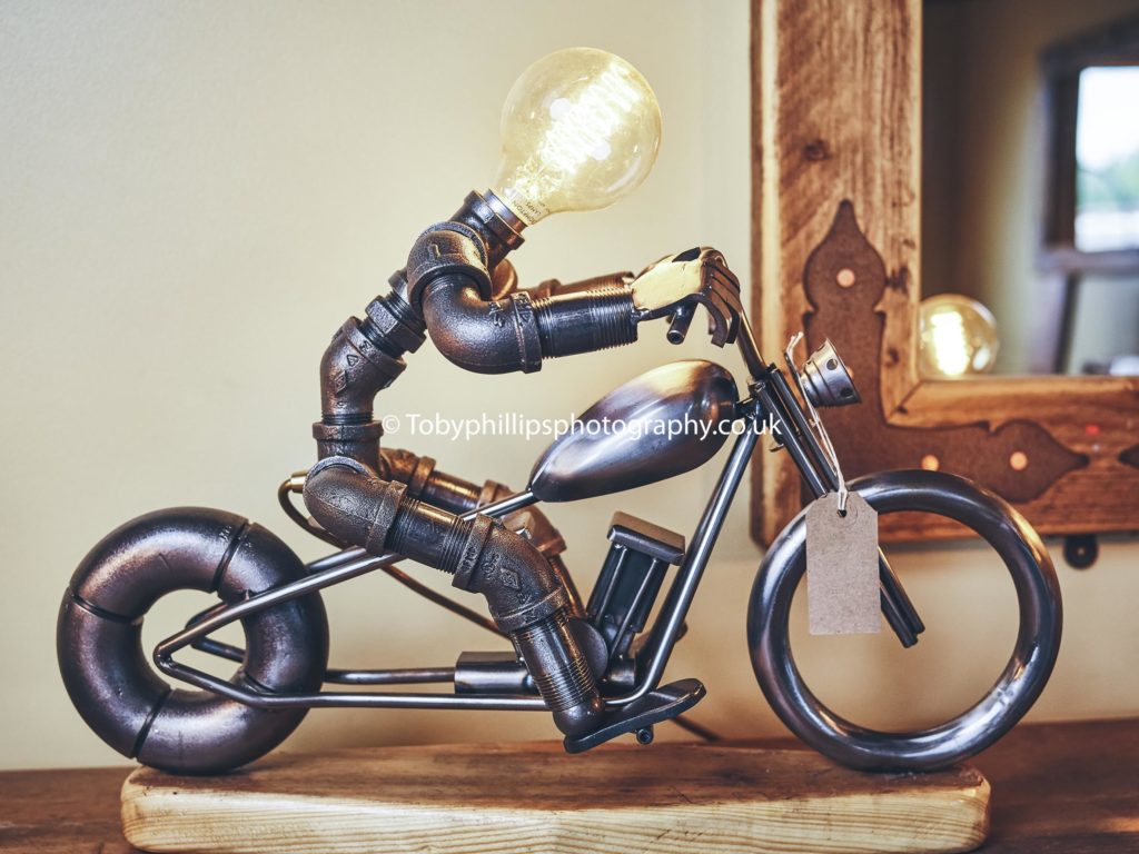 What was the result of that? We now make lighting and rustic wood furniture. Pete Barnes, who is affectionately known as Metal Bender, makes a lot of the pipe men and motorbike lights. He loves making them and has helped grow our profile too by posting photos on social media. People are fascinated by them!