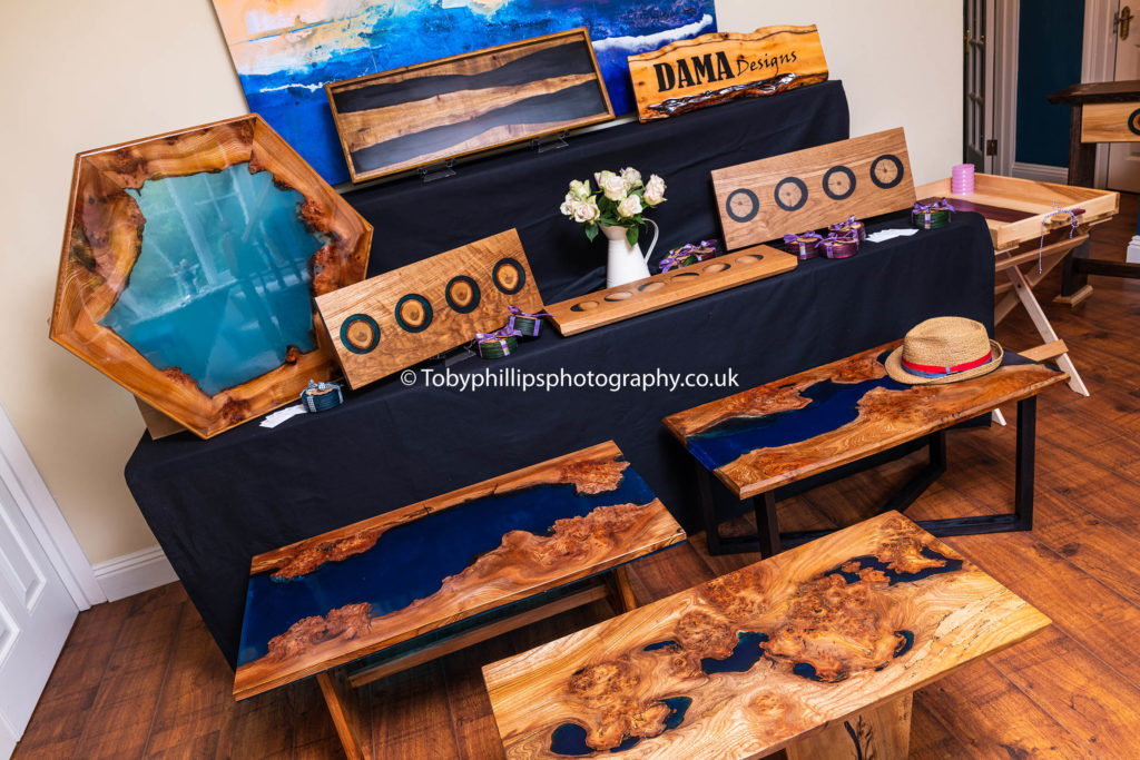 I sell charcuterie boards, Ottoman trays and coaster sets, all combining wood and resin. Some charcuterie boards are made from oak sourced from our own garden.