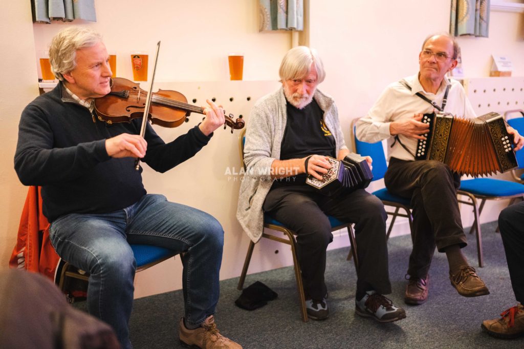 David: We try to offer variation. Bob has been on the circuit for many years and is always well-received, as songs like The Whitby Tailor get everyone involved. One of the great things is that anything can be turned into a folk song, as long as it can be performed live by one or two people. I’ve seen renditions of Fat Bottomed Girls by Queen and Money for Nothing by Dire Straits. Tonight, I sang Jesse James, a traditional country song played in the skiffle style, but we’ve had others play bluegrass or songs by English folk writers like Ewan McCall and Ralph McTell.