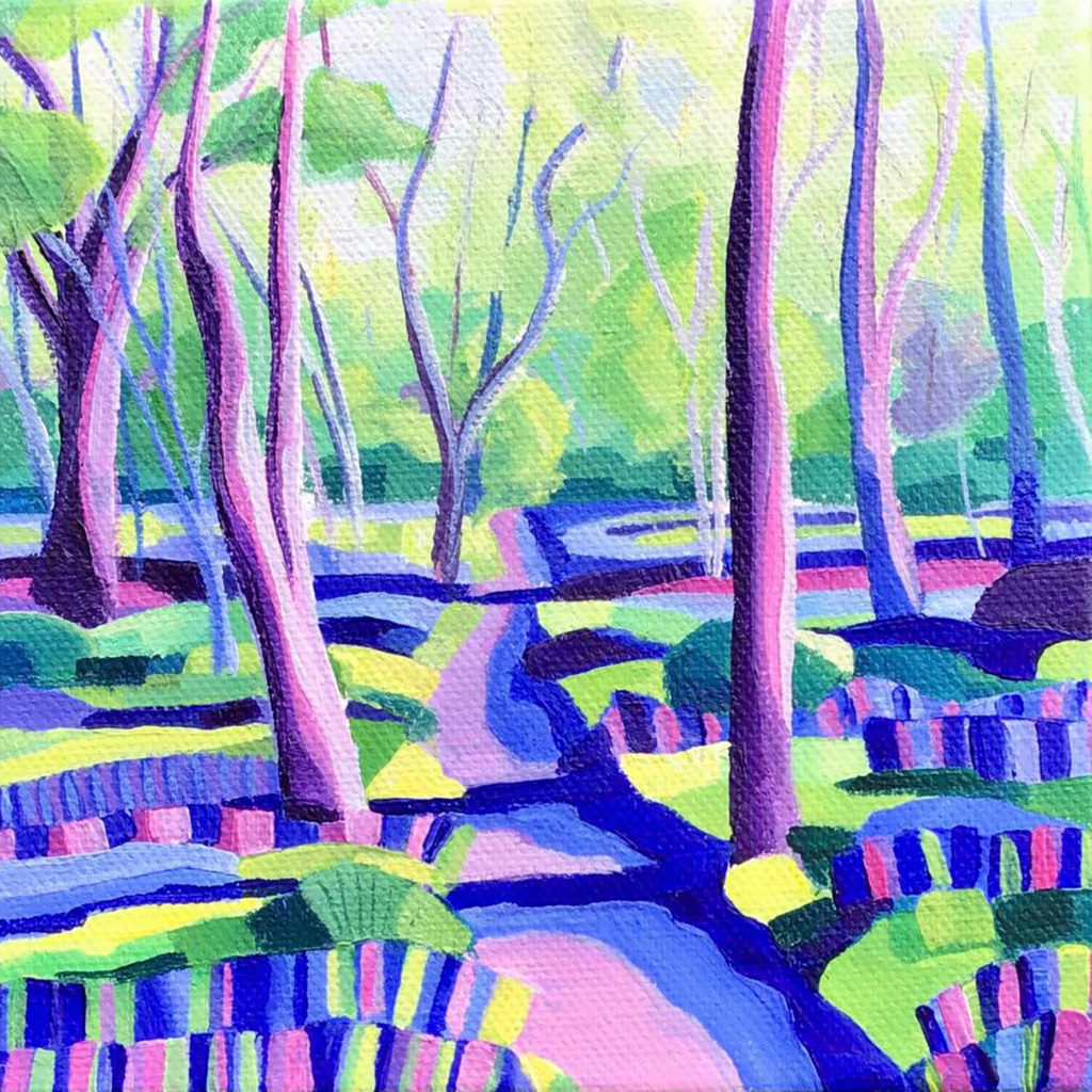 Traditionally, her output has had a distinctive style: local landscapes depicted in bursts of bold colour. In addition to Cissbury Ring, many scenes will be familiar to those who enjoy the South Downs. Living in Steyning, Sarah does not need to travel far to see Chanctonbury Ring or coastal highlights such as the Seven Sisters. Although these places may be close to her heart, it is usually a feeling that sparks a painting…
