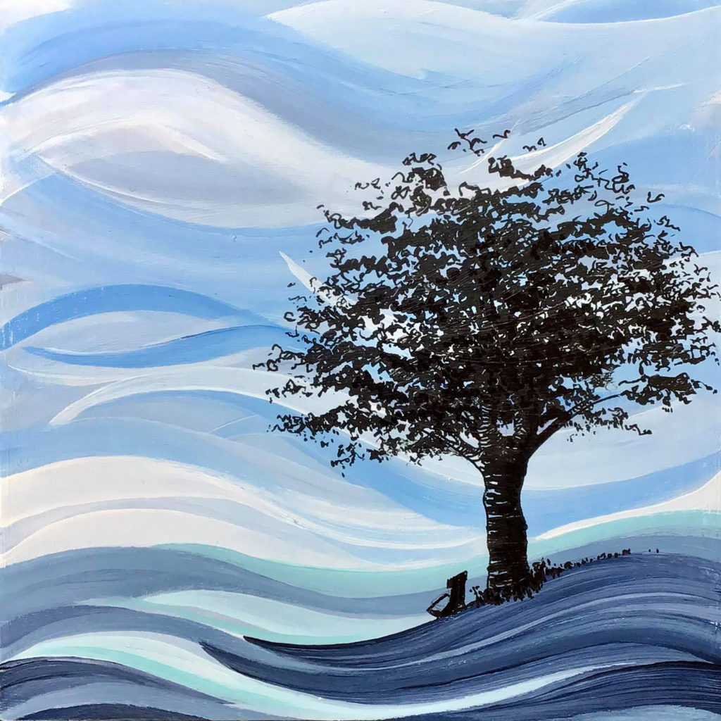 ‘Stuck’ gave Sarah the freedom to experiment with a wider range of colours, tones and materials, while also offering a chance to explore new themes, particularly movement. Naturally, some pieces from the project are more impressive than others. Perhaps the most immediately striking is from week 14. Initially titled ‘The One Where Lockdown Finally Got To Me’ and now titled ‘When The Silence Gets Too Loud’, it is Sarah’s take on Cissbury Ring. Its expressive, free-flowing whirl of greys and blues contrast with the darkness of a lone tree.