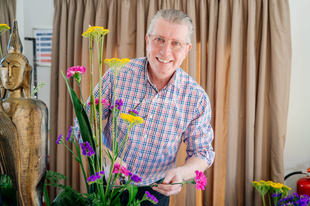 Jean: There is much more to flower arranging than many assume. It’s a very creative process, as you have to conjure something that is not only eye-catching, but has symmetry. If you have a big flower at the top and a little flower at the bottom, it’ll lose visual impact. I’m known for being honest with my critique, especially with demonstrators like Stephen, who welcomes feedback. It doesn’t happen very often, but if occasion calls for it, I can have a laugh with him and say, “Well, you got that one wrong!”