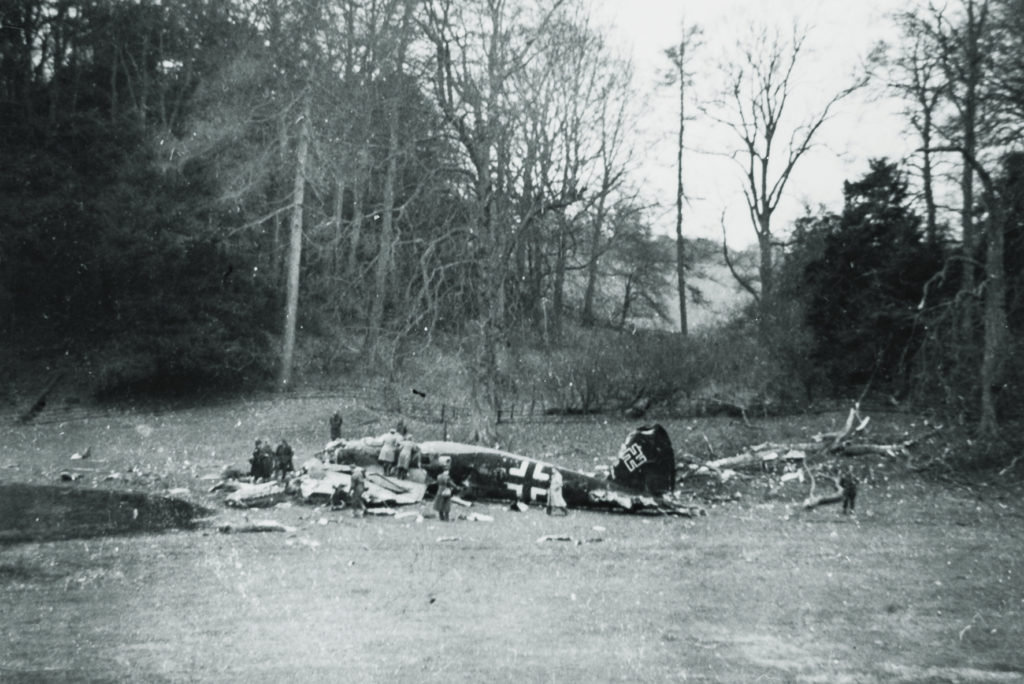 Bombs did fall on the estate. We had a very big bomb fall on the lawn, which blew the windows out and cows were killed in the field. Then on 9th April 1941 we had the plane crash.
